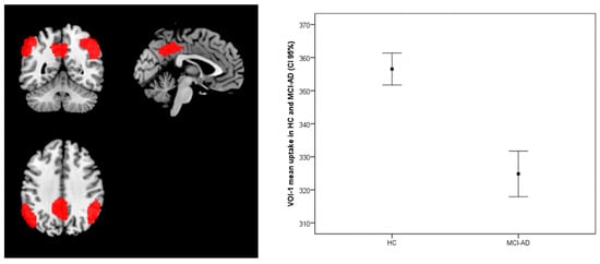 | Comparison: Brain metabolism HC vs. MCI-AD | 2191 | 0.000 | L Parietal | 5.47 | −48, −68, 52 | Inf. Parietal Lobule | 39 |