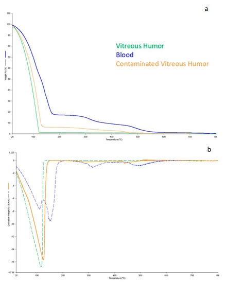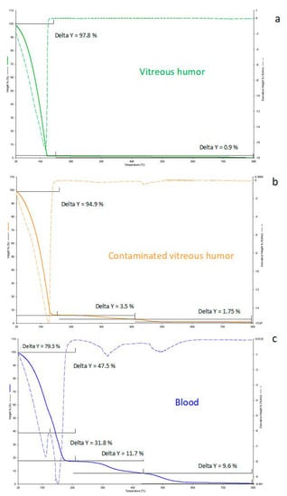 - Materazzi, S.; Risoluti, R.; Gullifa, G.; Fabiano, M.A.; Frati, P.; Santurro, A.; Scopetti, M.; Fineschi, V. New frontiers in thermal analysis: A TGA/Chemometrics approach for post-mortem interval estimation in vitreous humour. J. Therm. Anal. Calorim. 2017, 130, 549–557. [Google Scholar] [CrossRef]