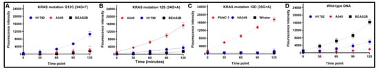 Time courses of fluorescence detection of CRISPR–Cas12a with specific crRNAs in cell lines: (A) fluorescence intensity of CRISPR–Cas12a with specific crRNA targeting KRAS 12C significantly raised with an increase in reaction time in DNA of H1792 cells that had G12C mutation (p = 0.011); (B) fluorescence intensity of CRISPR–Cas12a with specific crRNA targeting KRAS 12S significantly elevated with the reaction time in A549 cells that had G12S mutation (p = 0.003); (C) fluorescence intensity of CRISPR–Cas12a with specific crRNA targeting KRAS 12D significantly elevated with the reaction time in PANC-1 cells that possessed G12D mutation (p = 0.001); and (D) fluorescence intensity of CRISPR–Cas12a with specific crRNA targeting wild-type KRAS increased with the reaction time in BEAS2B cells that had wild-type KRAS (p = 0.008).