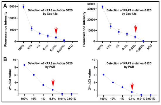 The dynamic ranges and sensitivities of CRISPR–Cas12a and PCR for the detection of KRAS mutations in serially diluted samples with different proportions of mutant KRAS DNA and wild-type KRAS DNA in the DNA of peripheral blood mononuclear cells (PBMCs) of a healthy donor: (A) CRISPR–Cas12a had a dynamic range of five orders of magnitude from 0.01% to 100% with a limit of detection (LOD) of 0.01% in the detection of the mutations; (B) PCR had a dynamic range of four orders of magnitude ranging from 0.1% to 100% with an LOD of 0.1%. The red arrow indicates the LOD of the tests. NTC, negative template control.