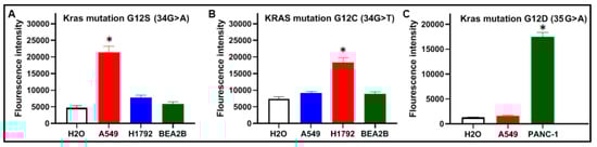 Specificity of CRISPR–Cas12a with crRNAs for the detection of KRA mutations: (A) CRISPR–Cas12a with crRNA targeting KRAS 12S identified the mutation only in the DNA of A549 cells that carry KRAS 12S; (B) CRISPR–Cas12a with crRNA targeting KRAS 12C detect the mutation only in the DNA of H1792 cells that carry KRAS 12C; and (C) CRISPR–Cas12a with crRNA targeting KRAS 12D detect the mutation only in the DNA of PANC-1 cells that carry KRAS 12D. (* p < 0.05).
