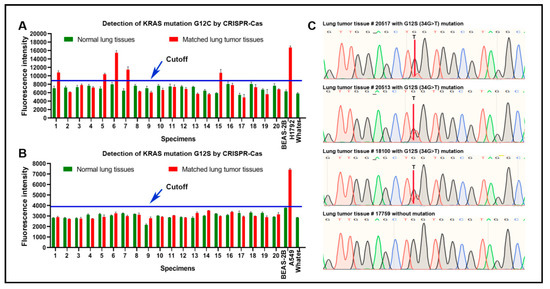 This study aimed to develop CRISPR–Cas12a as a test to sensitively detect KRAS mutations in lung cancer. KRAS 12C and KRAS 12S mutations were more commonly observed in lung cancer, whereas G12D mutation was frequently found in pancreatic cancer. Therefore, we examined the presence of KRAS 12C and KRAS 12S mutations in 20 lung tumor tissues and the matched noncancerous tissues by using CRISPR–Cas12a, PCR, and direct sequencing. The three different platforms were successfully performed in the surgically resected tissue specimens. The mean and standard deviation (SD) of fluorescence signals of CRISPR–Cas12a in all normal lung tissue specimens were 7257 and 742 for G12C, and 3050 and 306 for G12S, respectively. We set a cut-off value for determining positive mutation by adding two SDs on top of the mean of fluorescence signals obtained from the normal lung tissue specimens. As a result, the cutoff values for positive G12C mutation and G12S mutation were 8742 and 3663, respectively (Figure 5A,B). Based on the cutoff values, CRISPR–Cas12a identified G12C mutation in five (25%) of the 20 tumors, an incidence of the mutation in lung cancer consistent with previous studies [,]. Both PCR and direct sequencing could detect the KRAS G12C mutation in three tumor tissues. The five tumor tissues that were positive for KRAS G12C mutation by CRISPR–Cas12a included the three specimens that were positive by both PCR and direct sequencing (Figure 5C). The two tumor tissues that was positive for KRAS G12C mutation by CRISPR–Cas12a was negative by PCR and direct sequencing analysis. Therefore, Cas12a had a higher sensitivity (25%) compared with both PCR and direct sequencing analyses (15%) for the detection of KRAS mutation (All p < 0.01) in clinical tissue specimens.