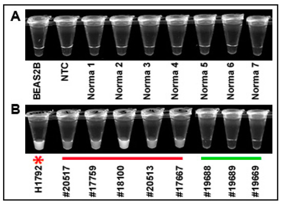 Directly visualizing the results of CRISPR–Cas12a for the detection of G12C mutation by naked eyes: (A) BEAS2B normal lung cells, NTC, and seven representative noncancerous lung tissue specimens had a negative result; (B) the five lung tumor specimens underlined in red and the H1792 cancer cells with a red star (#20517, 17759, 20513, 17567, and 18100) were positive for the 12G12 mutation as demonstrated by super-bright fluorescence signals. Three representative lung tumor tissue specimens underlined in green (#19688, 19689, and 19669) were negative for the mutation as demonstrated by the lack of fluorescence signal.