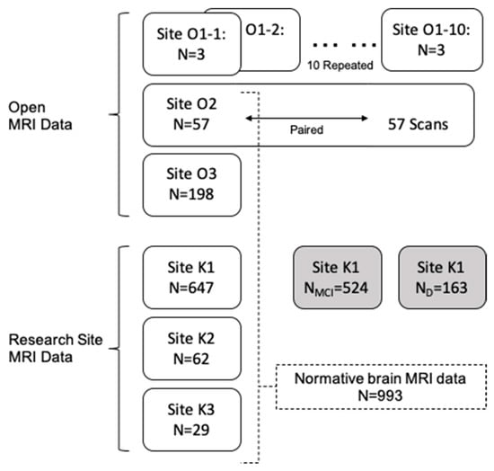 Data sets used in this study are shown by their source and their usage. MRI data from two sources are used: Open MRI data (Site ON) and our research site data (Site KN). Site O1, consisting of three subjects scanned at 10 (O1-1~O1-10) different sites, was used to investigate multicenter reliability. Site O2 data includes 57 paired scans for the same subjects from the same scanner and used (1) to measure repeated measure consistency and (2) to construct normative data. Sites O2, O3, K1, K2, and K3 are one-time scans from cognitive normal participants. Site K1 additionally includes data for MCI and dementia, compared with our multisite normative data. MCI, mild cognitive impairment; D, dementia.