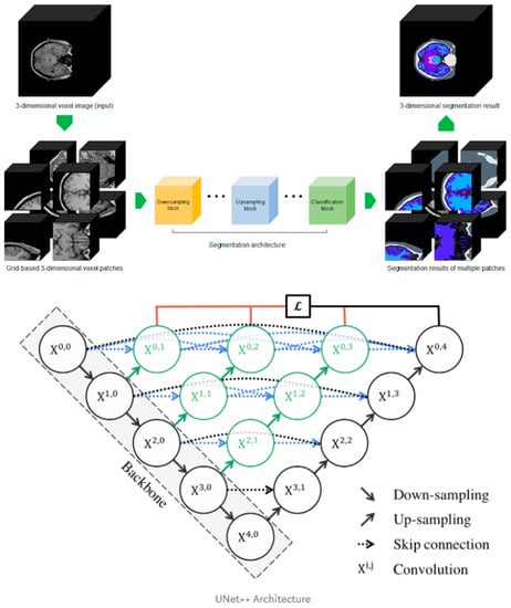 Three-dimensional patch-based training scheme explanation (upper) and Improved U-Net++ architecture (bottom).