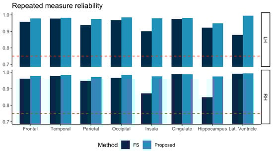 Repeated measure reliabilities for the volumes in eight sub-regions in left and right hemispheres (LH, RH) were evaluated using intraclass correlation (two-way, consistency) for three subjects scanned at 12 different sites. FreeSurfer (FS, dark blue) and the proposed method (light blue) are marked together for comparison. Other than the lateral ventricle (Lat. Ventricle) area, all the volumes were measured for gray matter tissue.