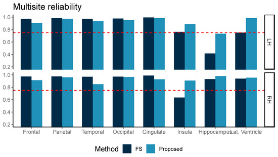 Multicenter reliability, intraclass correlation (ICC, two-way, agreement) was compared between two methods, FreeSurfer (FS) and the proposed method (Proposed, light blue). ICC was computed for two repeated measurements and the reference line at ICC = 0.75 is marked with the dotted red line.