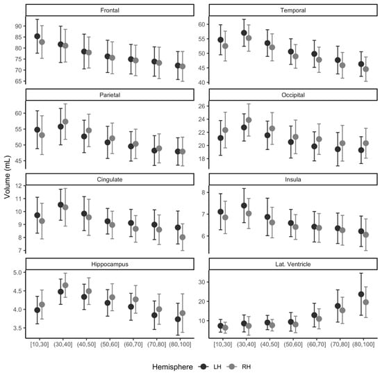 The trend of sub-regional brain volume and age group is shown in Figure 5 for the left and right hemispheres. The frontal lobe and lateral ventricle area showed a consistent decrease or increase in volume with age from 10 s to 90 s in both the left and right hemispheres. Other areas of interest, temporal, parietal, occipital, cingulate, insula, and hippocampus, presented increasing trend in volume until its ages of 30 s and then decreased with age.
