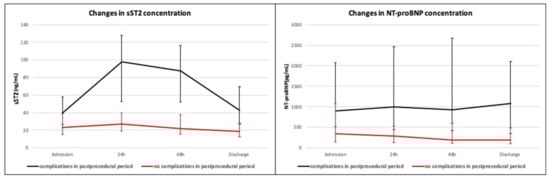 Further measurements in the whole studied group revealed a significantly higher sST2 concentration 24 h and 48 h after the BPA procedure, compared to the admission day measurements (33.31 ng/mL (IQR: 20.81–62.56), p = 0.000 and 27.45 ng/mL (IQR: 17.66–54.45), p = 0.028, respectively). In the analysis of all the procedures included in the study, the sST2 concentration obtained on the day of discharge from the hospital was significantly lower compared to the baseline measurements (21.59 pg/mL (IQR: 12.50–33.48) vs. 26.56 pg/mL (IQR: 16.66–40.83), p = 0.048). The dynamics of NT-proBNP and TnT concentrations were different, the concentrations of these biomarkers decreased 24 and 48 h after the procedure, with the lowest concentration recorded on the day of hospital discharge. Overall sST2, NT-proBNP and TnT measurements in periprocedural period at each time point are presented in Table 2.