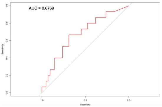 ROC analysis revealed that the area under the curve (AUC) for sST2 concentration assessed at hospital admission for prediction of complications in the postprocedural period was 0.6769. sST2 concentration assessed at admission day of 31.48 ng/mL or higher had a sensitivity of 66% and specificity of 69% for prediction of complications in postprocedural period (Figure 2).