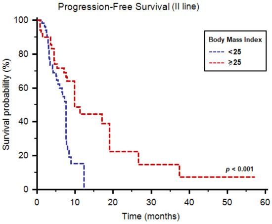The median PFS of cabozantinib as second-line therapy was 7.8 months (95%CI: 7.6–9.9) in the overall study population. The median PFS was significantly higher in patients with BMI ≥ 25 (9.9 months, 95%CI: 7.9–19.1, vs. 7.6 months, 95%CI: 5.9–12.3, p < 0.001, Figure 1).