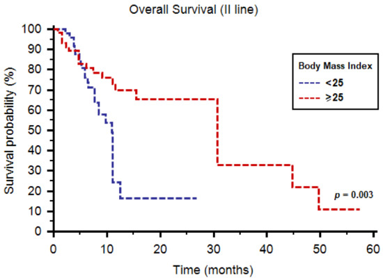 The median OS was 12.5 months (95%CI: 11.1–30.7) in all patients and was higher in the BMI ≥ 25 subgroup (30.7 months, 95%CI: 11.6–44.8, vs. 11.0 months, 95%CI: 9.7–11.2, p = 0.003, Figure 2).