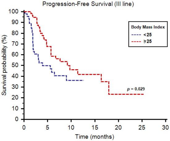 Progression-free survival of patients receiving cabozantinib as third-line therapy stratified by body mass index.