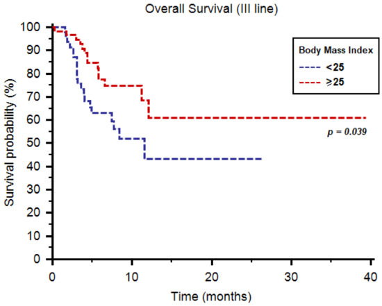 As third-line therapy, we registered median PFS and OS of 6.7 (95%CI: 4.9–18.0) and 39.4 months (95%CI: 11.2–39.4), respectively. Both median PFS (9.2 months, 95%CI: 4.8–16.3, vs. 3.9 months, 95%CI: 3.0–18.0, p = 0.029, Figure 3) and OS (39.4 months, 95%CI: 11.2–39.4, vs. 11.5 months, 95%CI: 4.9–11.5, p = 0.039, Figure 4) were longer in patients with BMI ≥ 25. One-year OS rate was 28% and 11% in patients with BMI ≥ 25 vs. <25, respectively (p = 0.045, Table 4). Similarly to second-line use of cabozantinib, no differences were reported in terms of tumor response to third-line cabozantinib (Table 4).
