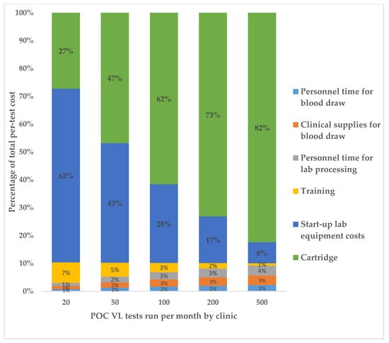 Percentage breakdown of total POC VL per-test costs per category, for varying clinic testing volumes (2020 USD).
