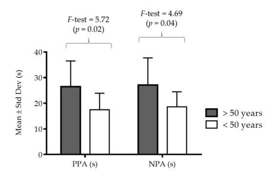 Figure 2 presents results of the PPA and NPA with differences between age-groups. The ANOVA revealed significant differences in both performances (F-test = 5.72 and 4.69, p < 0.05), and younger participants (<50 years) achieved better results than the older group (>50 years).