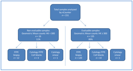From January 2017 to December 2019, we analyzed 151 samples by nCounter, including FFPE biopsies, cell blocks and cytological smears. Of them, 16/151 (11%) did not meet the quality requirements on nCounter analysis (geomean of housekeeping counts < 300) and were considered non evaluable. Three non-evaluable samples were cell blocks, one was a cytological smear and the remaining 12 were FFPE biospsies (Figure 1).