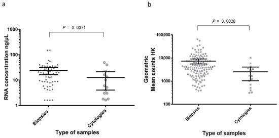 Among the valid samples (n = 135), 120 corresponded to FFPE biopsies, 14 were cell blocks, and one a cytological smear. All 15 evaluable cytological samples had more than 40% of tumor cells and presented adenocarcinoma histology. After purification, RNA concentration ranged between 1.65–49.3 ng/µL, as quantified by Qubit (Table 2 and Table 3). The FFPE biopsies showed a tumor infiltration between 5% and 85%; adenocarcinomas represented 80% of cases and RNA concentration was measured in 56/135 specimens, ranged from 1.65 to148 ng/µL, as measured with Qubit. The RNA was significantly different between cytological samples (n = 14) and biopsies (n = 56) (p = 0.037 in a Mann–Whitney test; Figure 2a). Also, upon nCounter analysis, the geometric mean of the endogenous gene counts was significantly higher in the biopsies (n = 120) vs. cytological samples (n = 15) (p = 0.0028 in a Mann–Whitney test; Figure 2b).