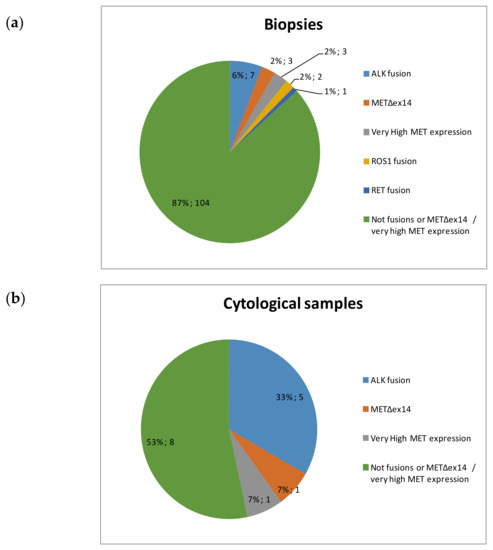 Although lung cancer continues to be one of the tumors with the highest mortality rate in the world, in recent years, the identification of specific alterations in various genes has allowed the development of targeted therapies, which have improved the clinical outcome of selected groups of patients. Mutations in the EGFR gene and the METΔex14 splicing variant associate with responses to EGFR and MET tyrosine kinase inhibitors, respectively (EGFR- and MET-TKIs) [1,2,3], while fusions involving ALK and ROS1 genes predict a clinical benefit from crizotinib, alectinib, and other ALK tyrosine kinase inhibitors (ALK TKIs) [4,5].