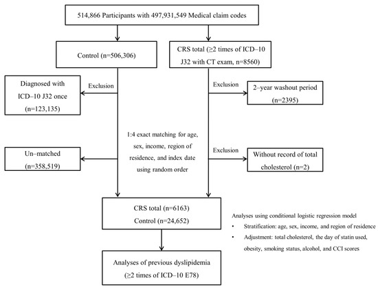 CRS patients (n = 8560) were selected from a total of 514,866 participants with 497,931,549 medical claim codes. Among the remaining participants (n = 506,306), those who had ever been treated with CRS of the ICD-10 code (J32) once from 2002 through 2015 (n = 123,135) were excluded. To select CRS patients who were diagnosed for the first time, we set a washout period of two years. CRS patients who were diagnosed from 2002 to 2003 (n = 2395) were excluded. Participants were excluded if they did not have records for total cholesterol (n = 2 for CRS patients). The control group was selected using a 1:4 matching with the CRS patients for sex, age, income group, and residence. To eliminate selection bias, the controls were selected in random order. The index date for each CRS patient was set as the time of treatment of CRS. The index date for controls was set as the index date of their matched CRS patient. Therefore, each matched CRS patient had a control with the same index date. During the matching process, 358,519 controls were eliminated. Finally, 6163 participants with CRS were 1:4 matched with 24,652 controls (Figure 1). Among the CRS patients, 2958 was those with CRScNP and 3205 was those with CRSsNP.