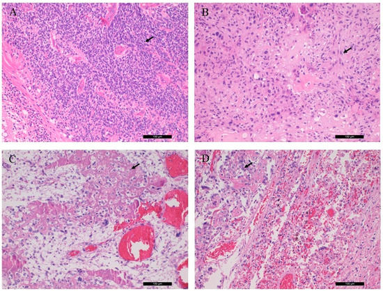 Conventional histological (H&E) characteristics of patient tumor samples. (A) Rb of the right eye bulb, (B) chondroblastic osteosarcoma of the left orbital bone, (C) osteoblastic osteosarcoma from the left tibia, (D) osteoblastic osteosarcoma, pulmonary metastasis. Arrows indicate retinoblasts, as well as chondroblastic and osteoblastic propagation (magnification: ×20).