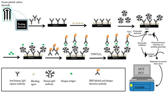 We previously developed an electrochemical biosensor for the detection of dengue-specific non-structural 1 (NS1) antigen. The biosensor, which was designed based on the principle of direct ELISA and fabricated using SPCEs, exhibited good sensitivity and specificity [18]. However, a more common approach for serological diagnosis of dengue in an endemic country, such as Malaysia, is the simultaneous detection of the dengue NS1 antigen and IgM antibodies. In infected patients, the dengue NS1 biomarker is detectable on the first day of fever. Several days following infection, the dengue NS1 level declines, while dengue-specific IgM and IgG antibodies start to elevate [19]. Thus, concurrent detection of the dengue NS1 antigen and IgM antibodies increases the accuracy and ease of diagnosing dengue at any time-point of infection, averts the drawback of repeated testing and ultimately provides prompt diagnosis to doctors. This study therefore aimed to develop a sensitive electrochemical biosensor for detecting dengue IgM antibodies, with the expectation that, in the future, it could be combined with an NS1 biosensor as a complete test package for dengue. In this proposed IgM electrochemical biosensor, we used an approach similar to our previously developed NS1 biosensor. However, rather than the principle of direct ELISA utilized for the NS1 biosensor, this IgM electrochemical biosensor was constructed based on IgM capture ELISA (MAC-ELISA) [18]. Consequently, the fabrication involved entirely different optimisation procedures and reagents than the previously developed NS1 biosensor. Furthermore, we demonstrated the potential application of the IgM biosensor on clinical samples.