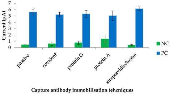 Comparison of various immobilisation techniques for the goat anti-human IgM capture antibody. NC: negative control consisting of a dengue IgM negative serum sample; PC: dengue IgM positive serum sample.
