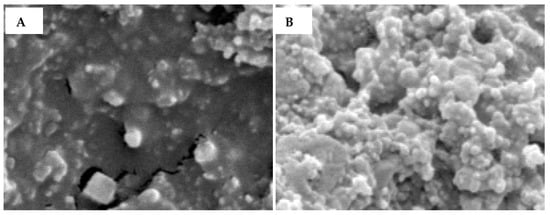 FESEM surface images of (A) a bare carbon electrode and (B) a carbon electrode modified with an anti-human IgM antibody using the streptavidin/biotin immobilisation system.