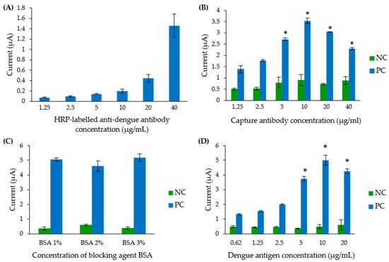 Optimisation of the concentration of various assay reagents. (A) Optimisation of the detection antibody concentration. (B) Optimisation of the goat anti-human IgM antibody. (C) Optimisation of the BSA concentration for blocking the electrode’s surface. (D) Optimisation of the dengue antigen concentration. NC: negative control (consisting of a dengue IgM negative serum pool), PC: positive control (consisting of a dengue IgM positive serum pool). * Indicates statistically significant current signals.
