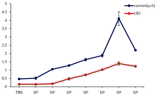 Electrochemical responses produced from different dilutions of serum samples are shown in Figure 5. When tested on the biosensor, serum dilutions of 101 to 106 generated current signals above the cut-off value (0.59 µA). Hence, the LOD of the developed biosensor was 106, and a linear relationship with the current signals was within 103 to 106 serum dilutions. However, as shown in Figure 5, the peak current response (4.10 µA) generated was at a 102 dilution, suggesting the ideal dilution for the assay. The electrochemical response was slightly inhibited at low serum dilution (101). This could be due to the matrix effect, where, at lower dilution, other substances present in the serum affect the binding between the target and its respective antibodies, resulting in a lower current signal. Further serum dilution can, however, weaken this matrix effect.