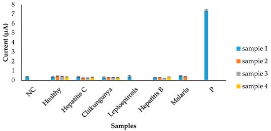 The electrochemical response generated during analytical specificity evaluation is demonstrated in Figure 6. A cut-off value of 0.45 µA was obtained from triplicates of dengue negative samples. When the developed biosensor was tested with a panel of six non-dengue serum samples, all of the serum samples generated current signals below the cut-off value. On the other hand, the developed biosensor generated a maximum current response (7.37 µA) for the dengue-specific IgM positive pooled serum sample (Figure 6). This suggests that the developed biosensor was highly selective for dengue-specific IgM antibodies, as it could clearly distinguish dengue IgM positive samples from the non-dengue sera.