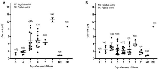 The electrochemical responses of 96 dengue IgM positive samples were classified according to infection status and days after onset of symptoms (Figure 7). As expected, the developed dengue IgM biosensor could accurately detect all dengue IgM positive samples from both primary (Figure 7A) and secondary (Figure 7B) infections, with current signals above the cut-off value (0.67 µA). The highest (4.94 µA) and lowest (1.26 µA) average current signals were attained from samples collected on day six and day three post-onset of symptoms, respectively, during primary dengue. Markedly, in comparison with secondary dengue, the average current signals obtained from sera with primary dengue were higher from day five post-infection.