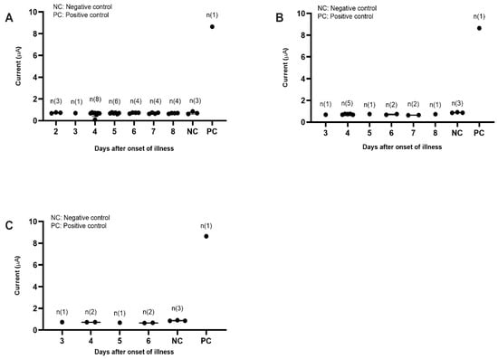 Diagnostic evaluation of the dengue IgM electrochemical biosensor using dengue negative sera. (A) The electrochemical response generated against dengue IgM and NS1 negative samples. (B) The electrochemical response generated against dengue IgM negative but NS1 positive samples (primary dengue). (C) The electrochemical response generated against dengue IgM negative samples (secondary infection).