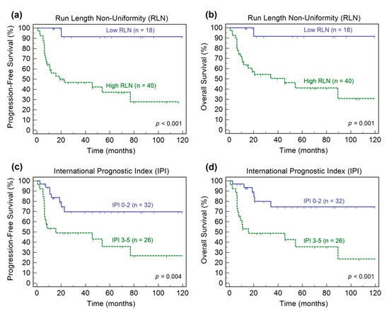 Kaplan–Meier estimates of progression-free survival and overall survival according to the baseline run length non-uniformity (a,b) and International Prognostic Index scores (c,d).