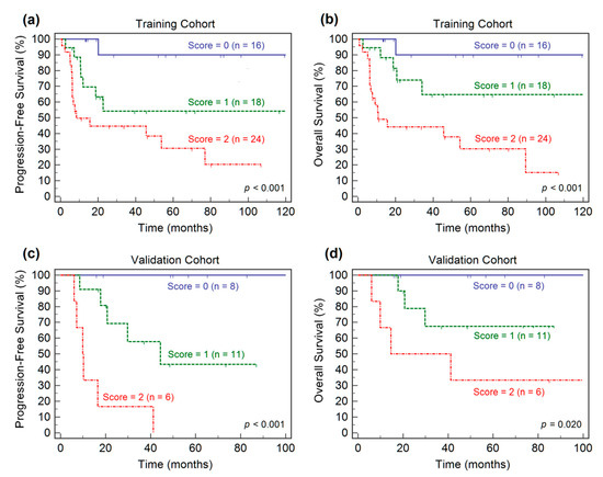 Kaplan–Meier estimates of progression-free survival and overall survival according to the prognostic stratification model in the training cohort (a,b) and the validation cohort (c,d).
