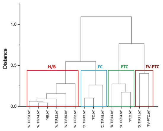 Agglomerative hierarchical clustering analysis (AHCA) dendrogram of the ten adenoma samples investigated. Notice that: 5 of them fall within the healthy cluster (labelled H/B, in red, A), while the others are spread among the three cancer categories, namely follicular carcinoma, labelled FC (blue, C), papillary carcinoma, labelled PTC (green, B)), and follicular variant of papillary carcinoma, labelled FV-PTC (brown, D). HB.txt, FC.txt, PTC.txt, and FV-PTC.txt indicate the reference spectrum for each category.