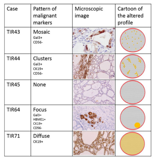 - Arcolia, V.; Journe, F.; Renaud, F.; Leteurtre, E.; Gabius, H.J.; Remmelink, M.; Saussez, S. Combination of galectin-3, CK19 and HBME-1 immunostaining improves the diagnosis of thyroid cancer. Oncol. Lett. 2017, 14, 4183–4189. [Google Scholar] [CrossRef] [PubMed]