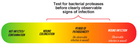 The BPA test (Woundchek™ laboratories, Gargrave, UK) provides a qualitative assessment of bacterial protease activity from the most common bacteria in chronic wounds (Staphylococcus aureus, Pseudomonas aeruginosa, Proteus mirabilis, and Enterococcus faecalis). It detects elevated bacterial proteases called virulence factors that correlate with bacterial pathogenicity. In a multicenter clinical trial, elevated BPA was associated with delayed wound healing. In addition, the detection of increased BPA permitted the identification of pathogenic bacteria in the wound prior to the onset of clinical signs and symptoms []. Ideally, clinicians would identify and treat pathogenic bacteria in the wound prior to the onset of CSS (Figure 1).