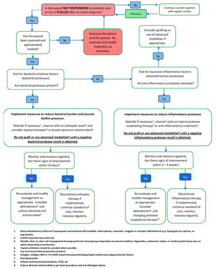 - Läuchli, S.; Swanson, T.; Serena, T.; Harding, K. The use of a point-of-care test for bacterial protease activity in chronic wounds. Wounds Int. 2015, 6, 22–28. [Google Scholar]