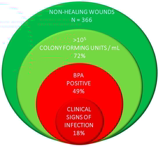 The consensus panel concluded that clinicians should test for BPA first. The panel maintained that the risk of invasive infection resulting from the presence of pathogenic bacteria was the greatest threat to the patient’s wellbeing. It was also recommended that clinicians consider testing patients with wounds that have failed to progress to rule out pathogenic bacteria as the cause for delayed wound healing. The opinion is supported by evidence from a multicenter clinical trial in which 39% of wounds had elevated BPA levels in the absence of signs of infection (Figure 3) [].