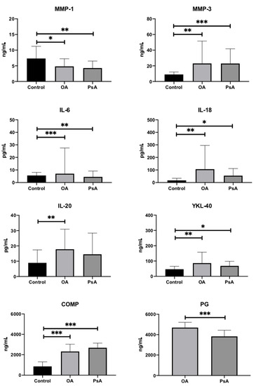- Waszczykowski, M.; Bednarski, I.; Narbutt, J.; Waszczykowska, E.; Lesiak, A.; Fabiś, J. Interleukin-18, interleukin-20, and matrix metalloproteinases (MMP-1, MMP-3) as markers of psoriatic arthritis disease severity and their correlations with biomarkers of inflammation and turnover of joint cartilage. Adv. Dermatol. Allergol. 2020, 37. [Google Scholar] [CrossRef]