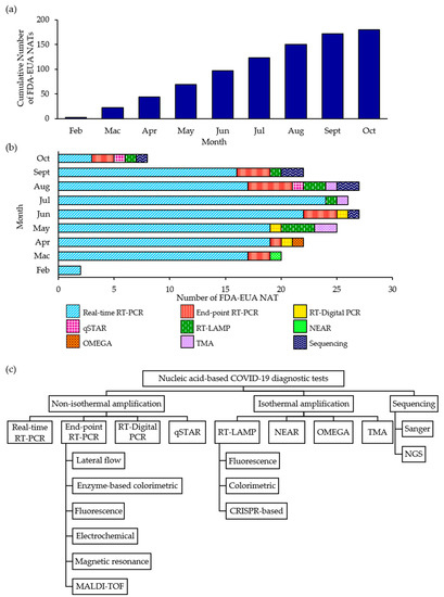 The discovery of a novel CoV as being responsible for the current pandemic necessitate the development of entirely new IVDs. Through the EUA procedure, a novel or unlicensed diagnostic tool is assessed on whether it can be authorized for use on a time-limited basis after a review is conducted on the documentary evidence submitted by the developer/manufacturer in support of the product’s safety, quality and performance. At the time of writing, a total of 180 NATs has been granted FDA-EUA status (Figure 1a,b) but an EUA may be revised or revoked since authorized tests are still monitored and subjected to the FDA’s continued review of emerging scientific evidence [60]. The FDA-EUA NATs can be broadly divided into three main categories: non-isothermal amplification-based (88.3%), isothermal amplification-based (8.3%) and sequencing-based (3.3%) NATs (Figure 1c). Real-time RT-PCR accounted for 77.2% of the authorized NATs and a large majority of the NATs are limited to Clinical Laboratory Improvement Amendments (CLIA)-certified, high-complexity laboratory settings only (87.2%). Less than 10% of the NATs are authorized to be performed in either CLIA-certified, high- or moderate-complexity laboratories (8.9%) while only 3.9% of the NATs can be performed in either CLIA-certified, high- or moderate-complexity laboratories or CLIA-waived patient care settings.