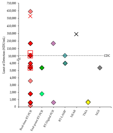 An accurate diagnosis of COVID-19 cannot be achieved through clinical presentation alone because the clinical signs and symptoms of SARS-CoV-2 infection are not distinctive enough from infections caused by other respiratory viruses and bacteria such as adenovirus, influenza viruses, parainfluenza viruses, respiratory syncytial virus (RSV), rhinovirus, other CoVs, Chlamydia, Legionella, and Mycoplasma [51,52,53,54]. Although virus culture method is generally considered the “gold-standard” for laboratory diagnosis of viral infection, the isolation of SARS-CoV-2 is highly restricted to laboratories with biosafety level 3 facilities [55] and the labor-intensive procedure rarely provides results in a timeframe that is quick enough to influence or impact treatment [56]. SARS-CoV-2 isolation is also not recommended by WHO as a routine COVID-19 diagnostic procedure [57]. Instead, nucleic acid amplification tests (NAATs), such as RT-PCR, are recognized as the standard diagnostic test for the confirmation of COVID-19 by the WHO [57] and CDC [58]. NAAT has become the norm in laboratory diagnosis of viral respiratory tract infection as it circumvents the longer turnaround time of the virus culture method and allows the identification of patients in the early stages of infection through direct detection of the viral genetic material [59].