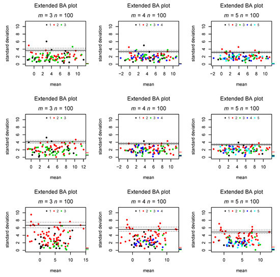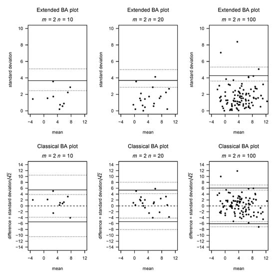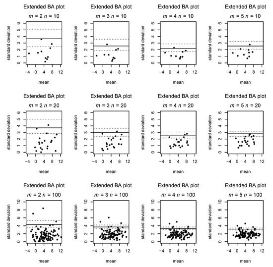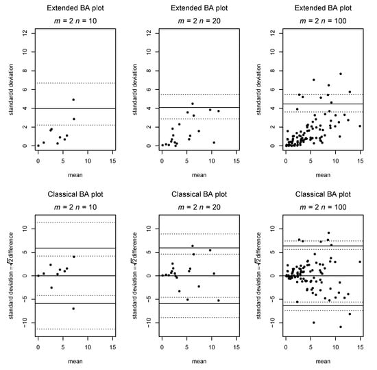 In the classical Bland–Altman plot (for ; see the lower row of Figure 1), the points: