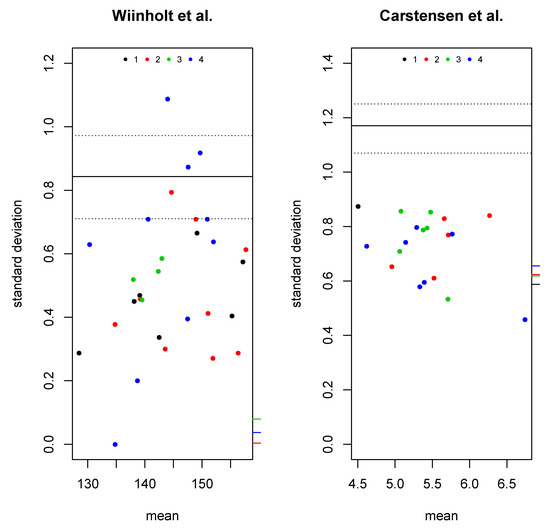 To investigate the usefulness of the extended BA plot, we applied it to two datasets with multiple raters from the literature. For the first application (Figure 5 left), we used data from Wiinholt et al. [21] corresponding to measurements of tissue volume in 30 control mice by four raters. Our plot corresponds to the results presented in the left side of Figure 3 of [21] as six separate BA plots. Our plot indicates an LOA around with a up to almost one and no clear bias, but possibly a tendency of Method 4 to be more variable compared to the other methods.