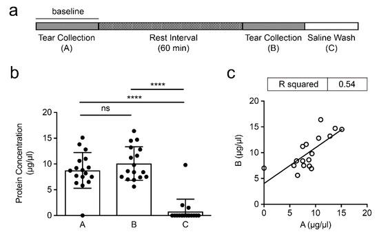 Analysis of total protein content and correlation between consecutive tear fluid collections. (a) Timeline showing the experimental steps of this study. (b) Protein concentrations of consecutive tear fluid collections (A, baseline; B, collection after rest interval; C, saline wash control). (c) Scatterplot depicting the correlation between (A) and (B). Symbols represent experimental data and lines represent regression fit. Data are shown as mean ± SD. Significance in (b) was determined using one-way ANOVA with Tukey’s post hoc test. **** p < 0.0001; ns, nonsignificant.