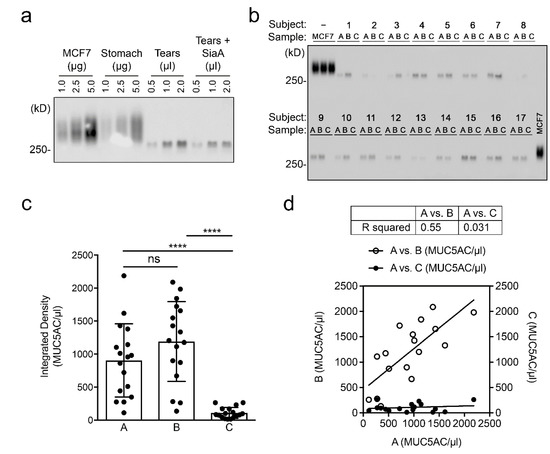 Analysis of MUC5AC mucin and correlation between consecutive tear fluid collections. (a) Detection of MUC5AC in pooled tear samples by immunoblotting. MCF7 whole-cell lysates and stomach mucin were used as positive controls. SiaA, Sialidase A. (b) Detection of MUC5AC in the 17 subjects that provided sufficient tears for analysis (A, baseline; B, collection after rest interval; C, saline wash control). (c) Quantification of the relative levels of MUC5AC per μL of tear fluid. (d) Scatterplot depicting the correlation between A vs. B or A vs. C. Symbols represent experimental data and lines represent regression fit. Data are shown as mean ± SD. Significance in (c) was determined using one-way ANOVA with Tukey’s post hoc test. **** p < 0.0001; ns, nonsignificant.