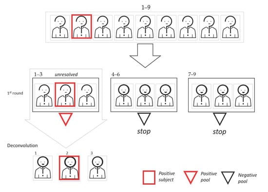 Starting with the pooling scheme, the simplest way to pool is a mono-dimensional (1D) protocol, where a number of samples are mixed before performing the experimental workup; then, only individual samples of the pools that gave a positive result are re-tested (deconvolution process). In Figure 1, we show a graphic representation of the 1D pooling scheme.
