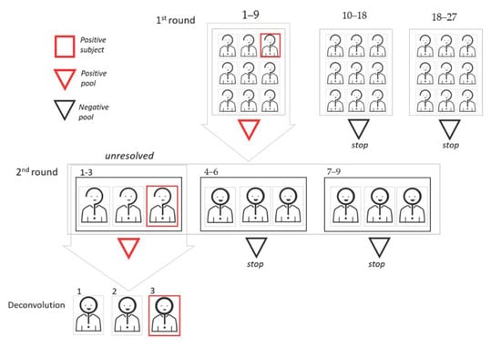 Graphic representation of the two-dimensional (2D) pooling approach. In this example, the cohort dimension is 27, and the first round pool size is 9. Since two pools result as negative in the first round, 12 subjects can be excluded. Sample aliquots from the nine subjects of the pool that tested as positive are used for a 1D pooling approach, where the pool size is 3.