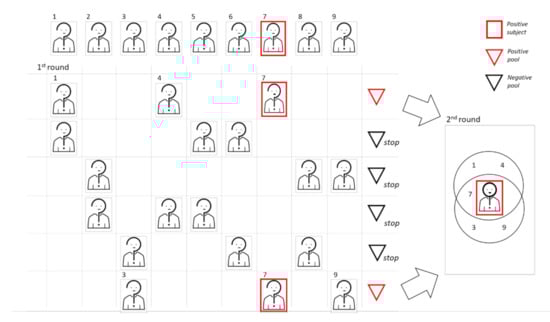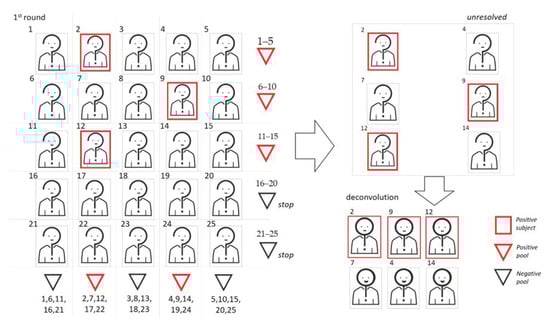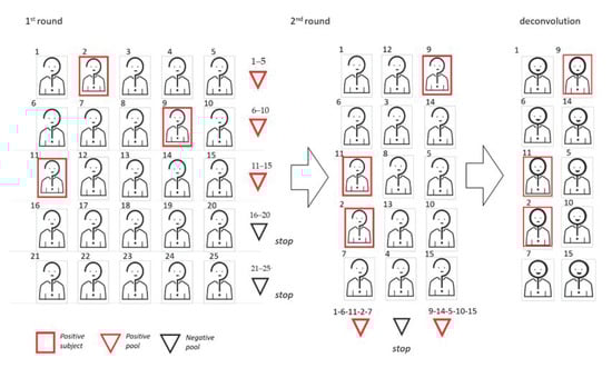 In the adaptative methods, the results from the earlier pools tests determine who is selected to build the subsequent pooling steps. Subjects belonging to negative pools are excluded from further investigations, while positive pools require further steps by analyzing its components. If the number of positive pools is large, the most frequent choice is to proceed with the creation and testing of second-level pools, with subsequent individual analysis only of the samples belonging to the positive second-level pools [9,10,11,12]. In the end, individual tests for sample unresolved by pooling have to be performed (deconvolution). Second-level pools can be built either by splitting positive pools in subpools (thus reducing the pool size at the second step) or rearranging samples completely (to use the same pool size in the two steps). Different strategies to build second-level subpools from positive first-level pools are discussed in [13]. Notice that, due to the structure of adaptative schemes, the different pooling steps have to be performed sequentially (in order to build the second pooling step, results of the first steps have to be known). This approach may slow down the analysis, but has the advantage of consistently reducing the tests to be performed in steps after the first one. In Figure 2, we show a graphic representation of two-dimensional (2D) pooling, in which positive first-level pools are split in smaller second-level subpools.